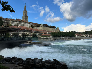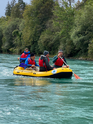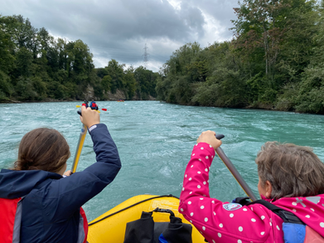 Teamausflug am 13. September 2024 ... am Tag, als sich der Sommer verabschiedet hat. Dick eingepackt horchten wir den Anweisungen des Vermieters, fassten 5 Schlauchboote mit Paddel und los gings auf der kühlen, glasklaren, ruhig fliessenden Aare. Unberührte Auenlandschaften, heraufkletterndes Efeu, grün der Fluss und grün das Ufer, man war in den Urwald versetzt. Dann aber nach fünf Kilometer flussabwärts folgte das Adrenalin-Tüpfelchen der Strecke. Die berühmt-berüchtigte Uttiger Schwelle hat schon manches Gummiboot zum Verzweifeln und Kentern gebracht, nicht so die Belegschaft der Schreinerei Furrer – da wird Hand in Hand gearbeitet, resp. gepaddelt! Nach der Brücke bei Rubigen steuerten wir einen Bräätliplatz an. Beim Anlegen des Bootes wurden Hosen und Schuhe noch restlos nass. Dank dem mitgeschleppten Holz war das Feuer schnell gemacht. Natürlich wurden wir auch da nicht von einem heftigen Regenguss verschont. Nach ca. 3-Stündiger Bootsfahrt thronte aus dem Nichts majestätisch das Bundeshaus vor der Altstadt-Kulisse. Dieser Anblick liess keine Matrosin und keinen Matrosen kalt. Aber Achtung, nicht lange schwelgen, denn hier im Marzili vor der Dalmazibrücke ist Endstation für alle Böötli. Wir wollten zwar ins Schwellenmätteli in die Güggelibeiz, aber keinesfalls bis ins Wehr. Vor dem Poulet-Plausch in der schön warmen Gaststube blieb noch Zeit, dem Bärengraben entlang und durch die Lauben von Bern zu schlendern. Auf dem Weg zum Bahnhof gings über den Bundesplatz - für einige das absolute Highlight des Tages, so nahe am Kernpunkt der Schweizer Demokratie zu sein.